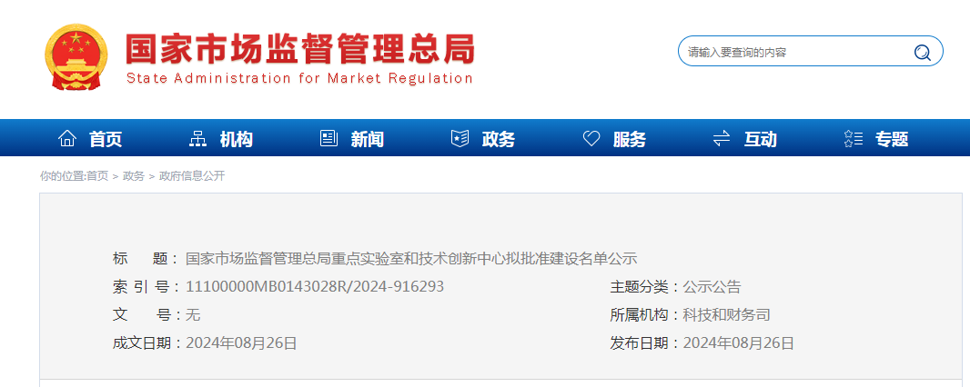 2024年8月26日官網公示國家市場監(jiān)督總局重點實驗室和技術創(chuàng)新中心擬批準建設名單。