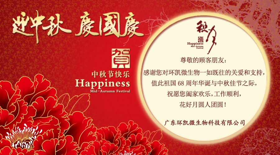 但愿人長久,千里共嬋娟。值此中秋佳節(jié)與祖國華誕68周年之際,在此廣東環(huán)凱微生物科技有限公司向長期以來支持、關(guān)心、幫助環(huán)凱微生物公司的各界朋友們,表示最衷心的祝福和最誠摯的敬意!祝您們節(jié)日愉快,闔家歡樂,幸福安康!
