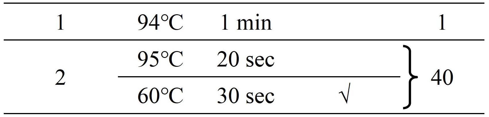注:在反應(yīng)階段2中60℃時(shí)收集熒光信號(hào),對(duì)于多通道熒光PCR儀,取 “FAM”“VIC”為信號(hào)采集通道,淬滅基團(tuán)選擇“None”,染料校正選擇“None”。