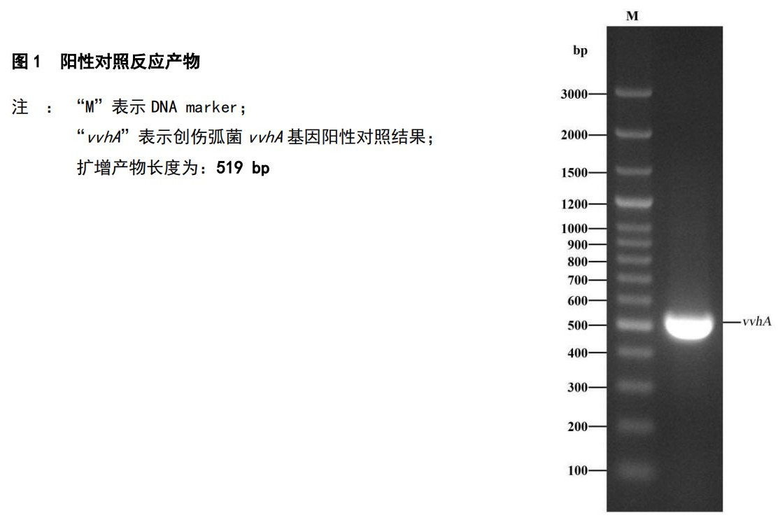 檢測(cè)原理:利用特異性引物和 PCR 反應(yīng)所需其他試劑,如反應(yīng)緩沖液、dNTPs 以及 Taq DNA 聚合酶等,加入待檢 DNA 模板樣品,即可進(jìn)行PCR 擴(kuò)增反應(yīng)。經(jīng)比對(duì)擴(kuò)增產(chǎn)物目標(biāo)條帶即可判定創(chuàng)傷弧菌 vvhA 基因。