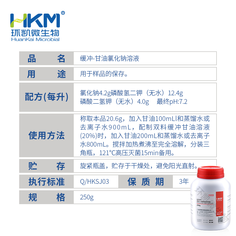 使用方法:稱取本品20.6 g,加入甘油100mLl和蒸餾水或去離子水900 mL,配制雙料緩沖甘油溶液時(shí),加入甘油200 mL和蒸餾水或去離子水800 mL。攪拌加熱煮沸至完全溶解,分裝三角瓶,121℃高壓滅菌15 min備用。
