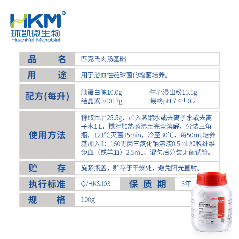 匹克氏肉湯基礎檢驗原理:胰蛋白胨、牛心浸出粉提供碳氮源、維生素和生長因子;脫纖維兔血(或羊血)為溶血性鏈球菌提供大量生長因子;結晶紫和三氮化鈉為選擇性抑菌劑。