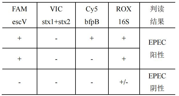 escV、stx1&stx2、bfpB、16S rRNA 基因分別對應熒光報告基團 FAM、VIC、Cy5、ROX。