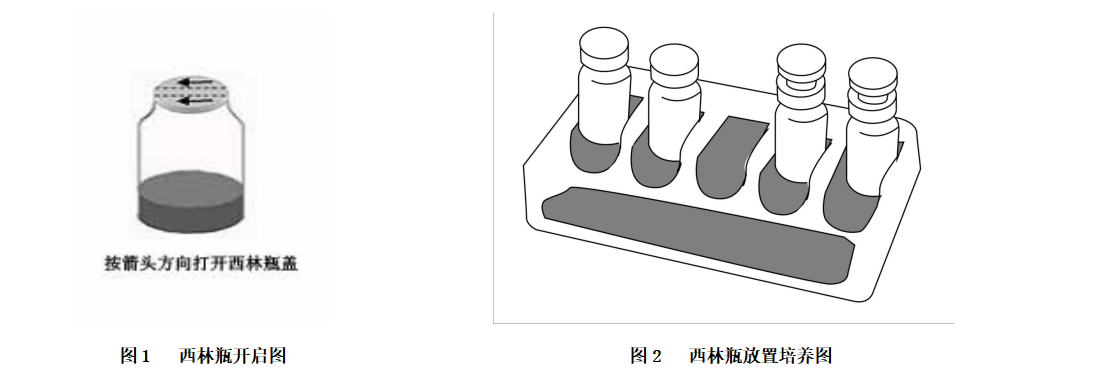 開啟西林瓶前,用75%酒精棉消毒西林瓶表面,在無菌條件下,按鋁蓋上的箭頭方向打開鋁蓋,撕開鋁蓋,打開西林瓶膠塞(如圖1)。所有的西林瓶在使用后均高壓滅菌后方可棄去。