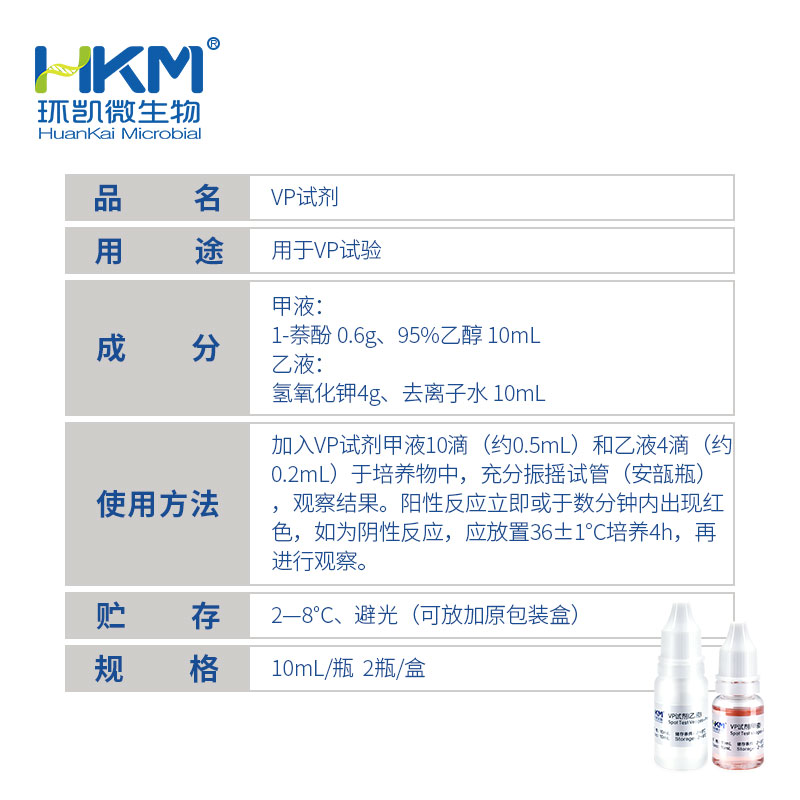 使用方法:滴加VP試劑甲液10滴(約0.5mL)和乙液4滴(約0.2mL)于培養(yǎng)物中, 充分振搖試管(安瓿瓶),觀察結果。陽性反應 立刻或于數分鐘內出現紅色,如為陰性,應放在36℃±1℃培養(yǎng)4h,再進行觀察。