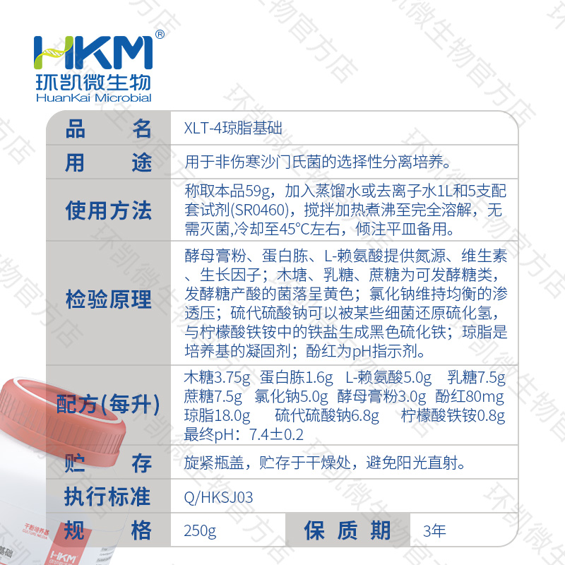 使用方法:稱取本品59g,加入蒸餾水或去離子水1 L,攪拌加熱煮沸至完全溶解,冷卻至45℃,每200mL基礎(chǔ)培養(yǎng)基添加1支XLT-4 瓊脂基礎(chǔ)配套試劑配成XLT-4 瓊脂培養(yǎng)基,制備平板備用。