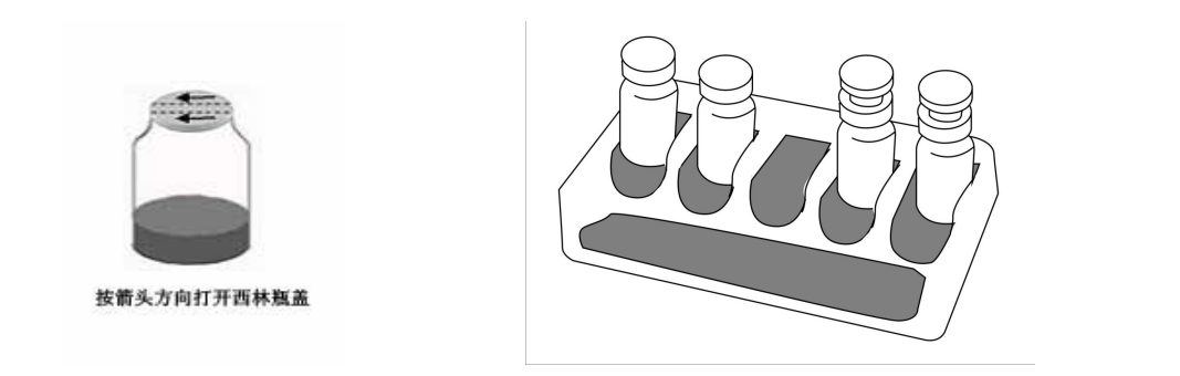 開啟西林瓶前,用75%酒精棉消毒西林瓶表面,在無菌條件下,按鋁蓋上的箭頭方向打開鋁蓋,撕開鋁蓋,打開西林瓶膠塞(如圖1)。所有的西林瓶在使用后均高壓滅菌后方可棄去。