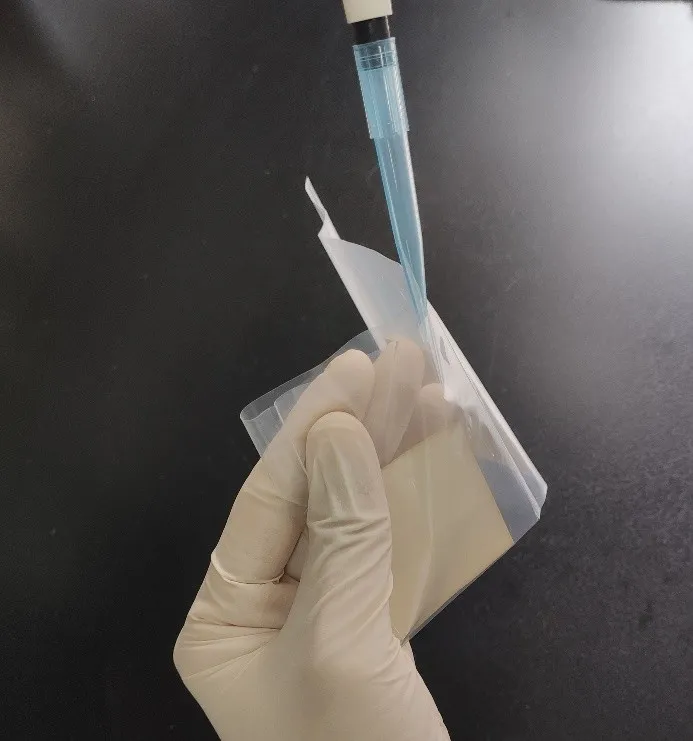 - 將水樣稀釋后,對(duì)應(yīng)梯度取一定的接種量,加入到袋裝的紙片中,如下圖所示: