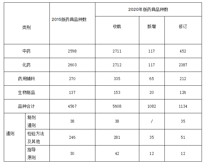 新版藥典新增319種,修訂3177種,不再收載10種,品種調(diào)整合并4種,共收載品種5911種。一部中藥收載2711種,其中新增117種、修訂452種。二部化學藥收載2712種,其中新增117種、修訂2387種。三部生物制品收載153種,其中新增20種、修訂126種;新增生物制品通則2個、總論4個。四部收載通用技術要求361個,其中制劑通則38個(修訂35個)、檢測方法及其他通則281個(新增35個、修訂51個)、指導原則42個(新增12個、修訂12個);藥用輔料收載335種,其中新增65種、修訂212種(見表1)。