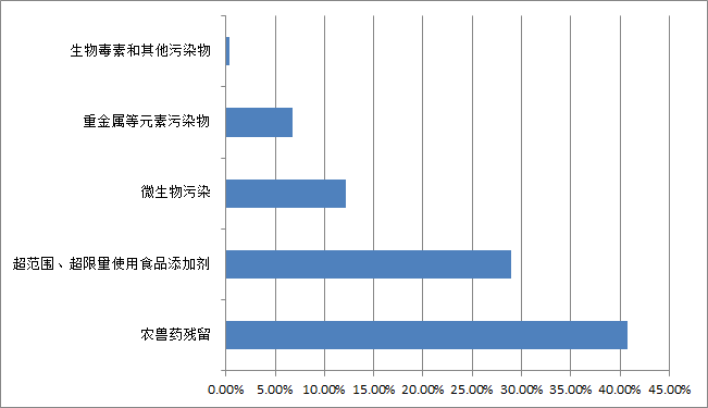 從不合格的項(xiàng)目類別看,主要是農(nóng)獸藥殘留占不合格樣品總數(shù)的40.71%,超范圍、超限量使用食品添加劑占28.93%,質(zhì)量指標(biāo)占12.14%,微生物污染占11.43%,重金屬等元素污染物占6.79%,生物毒素和其他污染物分別占0.36%。