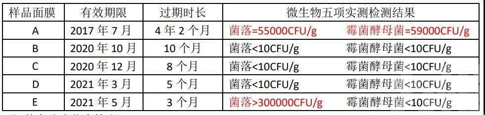經(jīng)測試,在五款過期面膜中,有兩款超標(biāo),一款是過期四年兩個月的面膜,它的菌落總數(shù)為55,000CFU/g,霉菌總數(shù)為59,000CFU/g;另一款是過期三個月的面膜,它的菌落總數(shù)大于300,000CFU/g。其余致病菌未檢出。