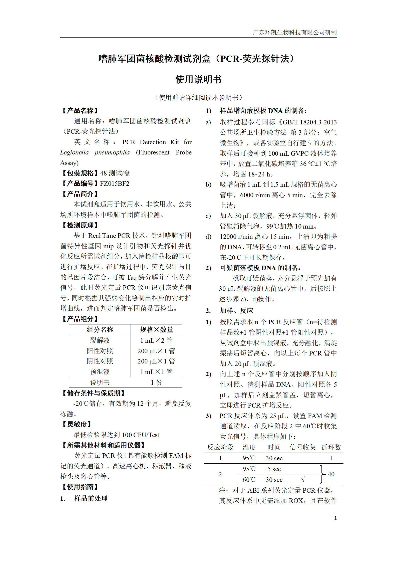 FZ015BF2 嗜肺軍團菌核酸檢測試劑盒 產(chǎn)品使用說明書