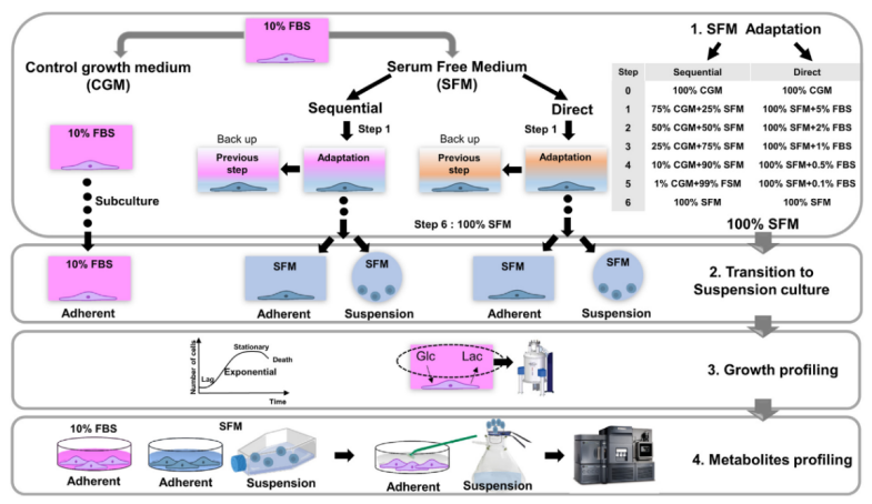 該論文描述了將HEK293細(xì)胞由血清培養(yǎng)轉(zhuǎn)化到無血清培養(yǎng),并懸浮馴化的過程,并探究了細(xì)胞在不同培養(yǎng)條件、不同馴化方式及不同表型下的代謝差異。