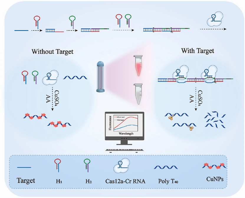 快速靈敏地檢測(cè)病原菌對(duì)疾病預(yù)防和控制至關(guān)重要。具有 DNA 切割能力的 CRISPR/ Cas12a 系統(tǒng)有望用于病原菌診斷。然而,基于CRISPR的檢測(cè)方法的靈敏度不夠理想,且成本較高。在此背景下,Yanfei Qi團(tuán)隊(duì)發(fā)表在Analytica Chimica Acta上的文章《A programmable sensitive platform for pathogen detection based on CRISPR/Cas12a-hybridization chain reaction-poly T-Cu》報(bào)告了一種基于 CRISPR/Cas12a 系統(tǒng)、雜交鏈反應(yīng)(HCR)和聚 T-銅熒光納米探針的多功能靈敏病原體檢測(cè)平臺(tái)(HTCas12a)。