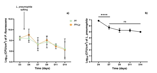 如圖1a所示,在這兩種情況下,熒光假單胞菌的數(shù)量在第3天至第14天均無顯著變化。熒光假單胞菌的細胞密度未受到嗜肺軍團菌存在的顯著影響。但如圖1b所示,在第4天至第7天,每個生物膜體積的嗜肺軍團菌可培養(yǎng)數(shù)量減少了1個對數(shù),之后一直并保持在5 log10 CFU/cm3左右,直到實驗結(jié)束。