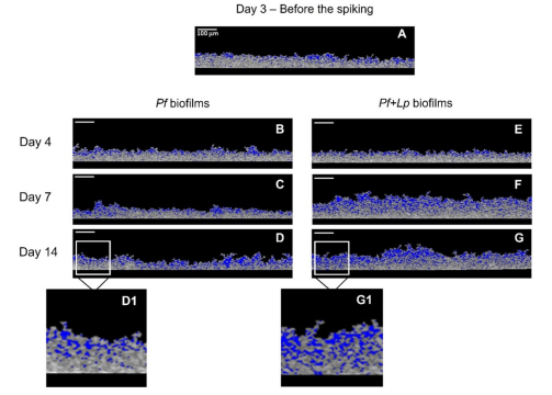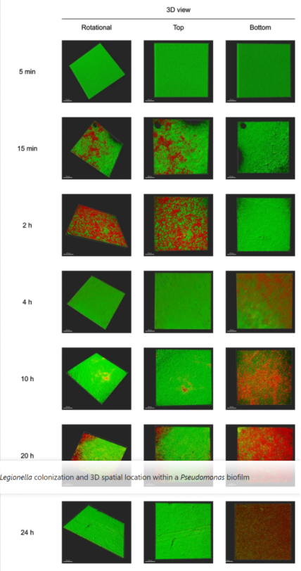 在加標(biāo)后的最初5分鐘內(nèi)未觀察到嗜肺軍團菌。加標(biāo)后 15 分鐘,在生物膜的頂面檢測到一層薄薄的嗜肺軍團菌。隨著時間的流逝,觀察到生物膜頂部嗜肺乳桿菌的增加,表明細菌正在積累。到4小時時,大量的嗜肺軍團菌開始出現(xiàn)在生物膜的底層,同時頂部的細菌減少。這種遷移繼續(xù)進行,到 24 小時觀察期結(jié)束時,嗜肺軍團菌主要位于生物膜的底部。