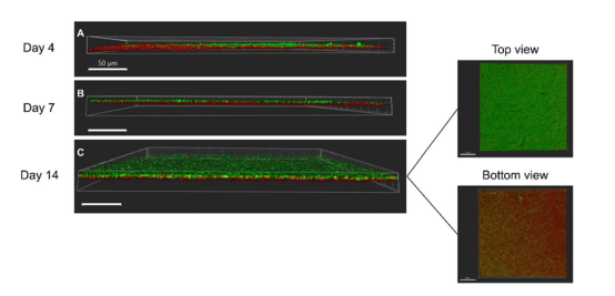 圖 5 4天、7天和14天加標(biāo)嗜肺軍團菌生物膜的代表性 CLSM 圖像;后者用PNA探針(紅色)染色。