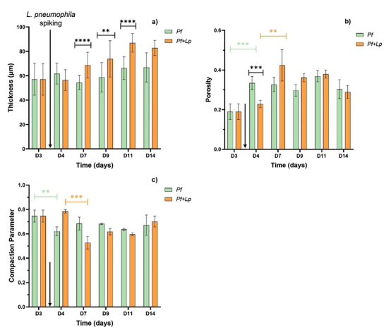 當(dāng)嗜肺軍團菌定植在熒光假單胞菌生物膜上時,在第3天和第4天之間沒有發(fā)現(xiàn)顯著差異,它們保持了其中尺度結(jié)構(gòu)(圖3的OCT圖像,圖4厚度、孔隙率和壓實參數(shù)進行量化)。軍團菌加標(biāo)生物膜結(jié)構(gòu)的差異僅在晚些時候才明顯。然而,厚度遵循不同的趨勢:從第7天到第14天,加標(biāo)生物膜逐漸變得比對照組更厚。