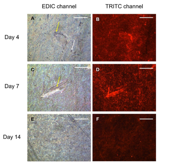 圖 4使用EDIC通道(圖像A,C和E)和 TRITC濾光片(圖像B,D和F)可視化生物膜。 白色箭頭表示微菌落,黃色箭頭表示高度定植的區(qū)域。