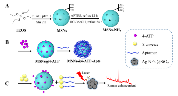 在本文中,作者介紹了一種一種簡單而新穎的生物傳感器,用于定量測定金黃色葡萄球菌。該方法基于從適配體門控胺化介孔二氧化硅納米顆粒(MSNs)中靶誘導(dǎo)釋放信號分子,并結(jié)合表面增強(qiáng)拉曼散射(SERS)技術(shù)。合成了MSN,然后用(3-氨基丙基)三乙氧基硅烷對其進(jìn)行氨基修飾,使其帶正電。接下來,信號分子(4-氨基噻吩,4-ATP)被加載到MSNs的孔中。然后,通過靜電相互作用,將金黃色葡萄球菌的負(fù)電荷適體組裝在MSNs表面。加入金黃色葡萄球菌后,組裝好的適體與細(xì)菌特異結(jié)合。此,“門”被打開,導(dǎo)致4-ATP從MSNs的孔隙中釋放。用拉曼光譜儀對釋放的分子進(jìn)行測量,發(fā)現(xiàn)4-ATP在1071 cm?1處的強(qiáng)度與金黃色葡萄球菌濃度呈線性相關(guān)。同時,作者還制備了一種銀納米花二氧化硅核殼結(jié)構(gòu)(Ag NFs@SiO2),并將其作為SERS襯底。在優(yōu)化的實驗條件下,線性關(guān)系良好(y = 2107.93 + 1536.30x, R2 = 0.9956),線性范圍為4.7 × 10 ~ 4.7 × 108 cfu/mL,檢出限為17 cfu/mL。該方法成功應(yīng)用于魚類樣品中金黃色葡萄球菌的分析,回收率為91.3~109%。