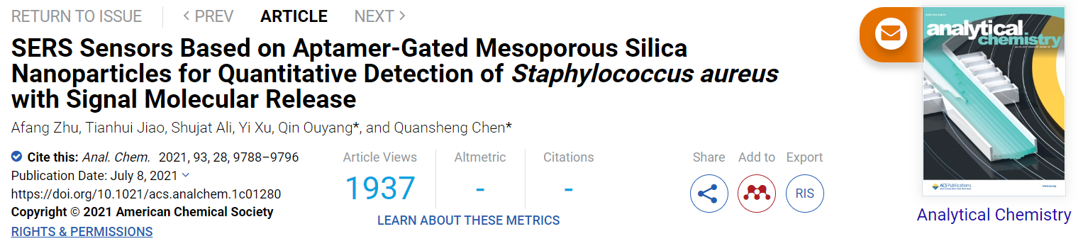 參考文獻(xiàn):Zhu A, Jiao T, Ali S, Xu Y, Ouyang Q, Chen Q. SERS Sensors Based on Aptamer-Gated Mesoporous Silica Nanoparticles for Quantitative Detection of Staphylococcus aureus with Signal Molecular Release. Anal Chem. 2021 Jul 20;93(28):9788-9796. doi: 10.1021/acs.analchem.1c01280. Epub 2021 Jul 8. PMID: 34236177.