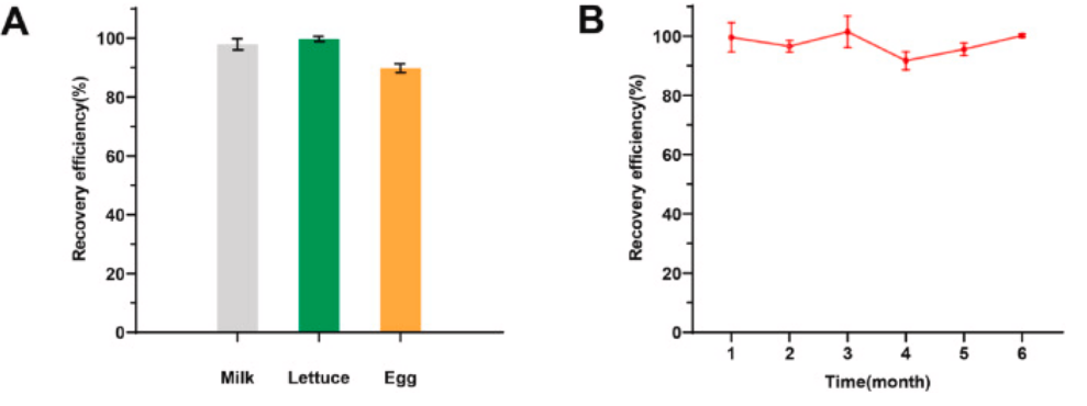 評(píng)估生物探針在食物基質(zhì)中的效果,結(jié)果表明,該探針在牛奶、生菜、雞蛋中的細(xì)菌回收率幾乎為100%,且該探針在4℃下保存6個(gè)月后回收效率仍然保持高水平,即說明該探針可在4℃下保存數(shù)月。
