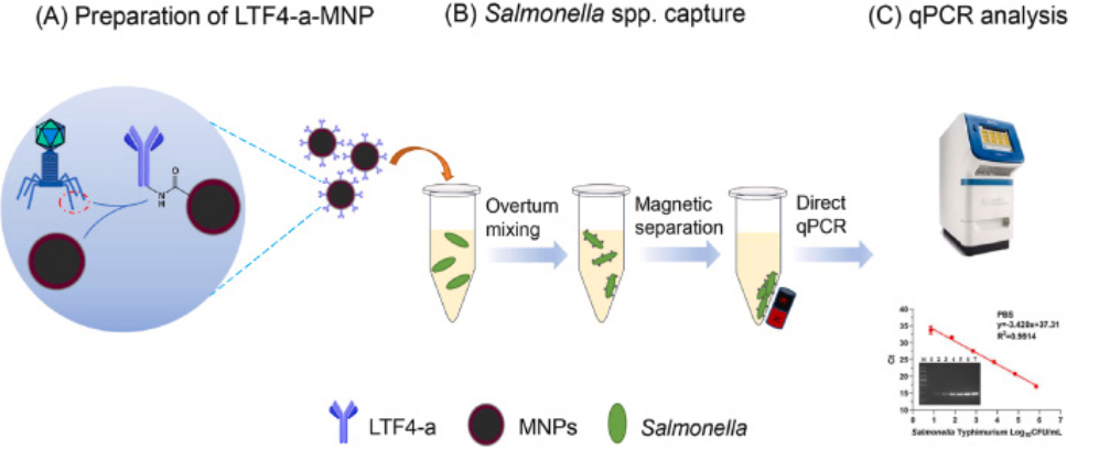 通過噬菌體長(zhǎng)尾纖維蛋白固定磁性納米粒子,實(shí)現(xiàn)快速、超靈敏檢測(cè)沙門氏菌