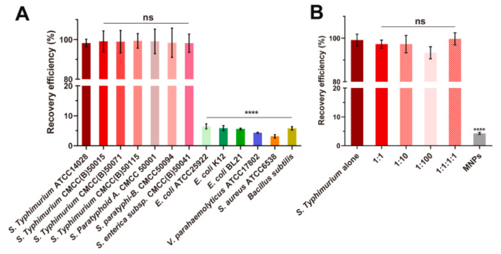 對(duì)生物探針檢測(cè)特異性的探究,將所有測(cè)試用的細(xì)菌濃度調(diào)整一致,結(jié)果表明生物探針對(duì)沙門氏菌的回收效率不受到其他菌株的影響(圖5)。