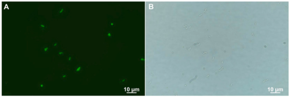 為了確定LTF4-a是否能夠結(jié)合沙門氏菌細(xì)胞,將FITC標(biāo)記的重組LTF4-a與鼠傷寒沙門氏菌ATCC14028細(xì)胞一起孵育,并在熒光(FL)顯微鏡下檢查(圖2)。在FL顯微鏡下在鼠傷寒沙門氏菌ATCC14028細(xì)胞上觀察到綠色熒光。