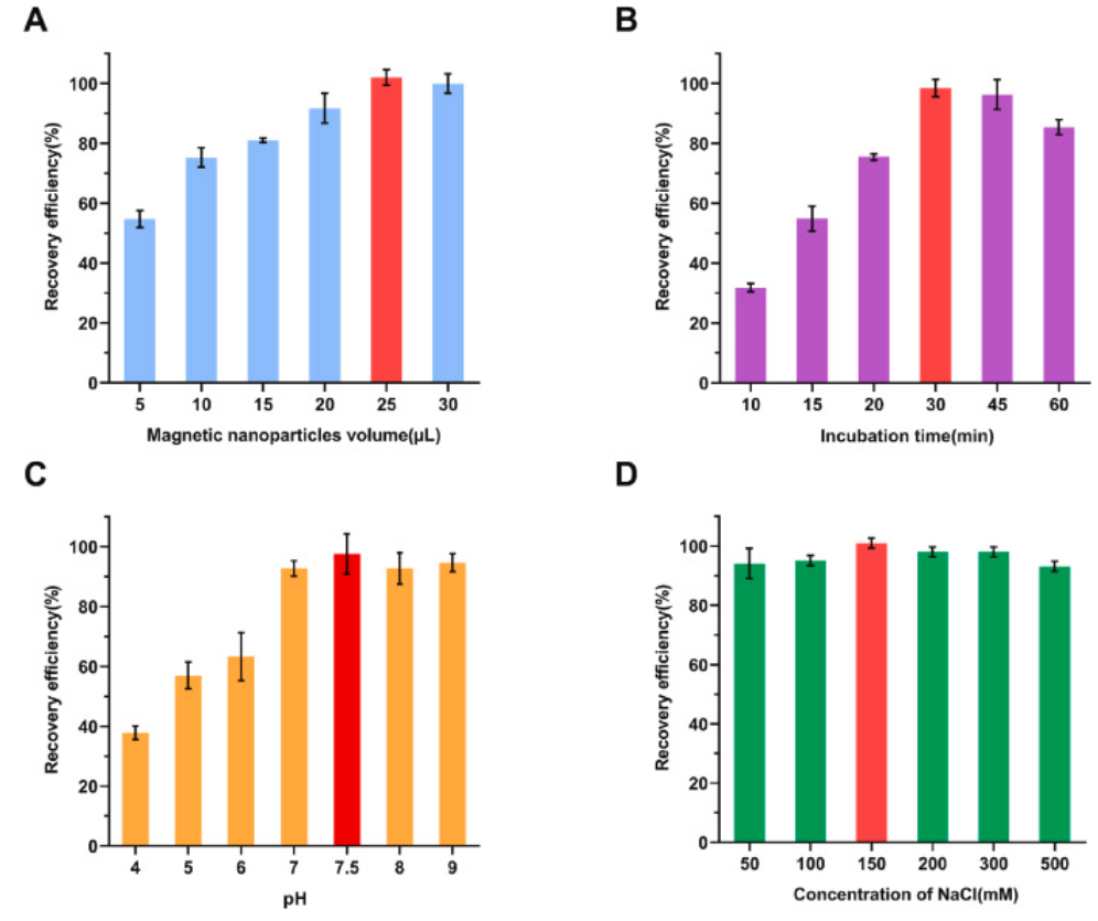 對(duì)LTF4-a-MNP生物探針的沙門氏菌細(xì)胞結(jié)合效率進(jìn)行優(yōu)化,分別從(1)LTF4-a-MNP的單反應(yīng)體積,(2)LTF4-a-MNP與沙門氏菌培養(yǎng)物的孵育時(shí)間,(3)反應(yīng)溶液的pH值,以及(4)反應(yīng)溶液中的NaCl濃度四個(gè)條件進(jìn)行優(yōu)化。結(jié)果如圖4所示,紅色柱子表示最佳的反應(yīng)條件。