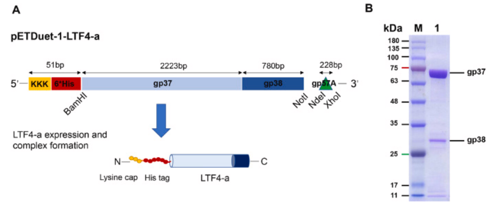 A圖為表達(dá)載體的構(gòu)建,其中g(shù)p57A是長(zhǎng)尾纖維形成伴侶,為了最大限度地提高gp38的宿主受體結(jié)合能力,在LTF4-a的N端加入6×His-tag和3賴氨酸帽,使用高純度的大腸桿菌表達(dá)系統(tǒng)成功獲得重組LTF4-a蛋白,產(chǎn)量為6-8mg / L;B圖為表達(dá)蛋白的SDS-PAGE驗(yàn)證結(jié)果。