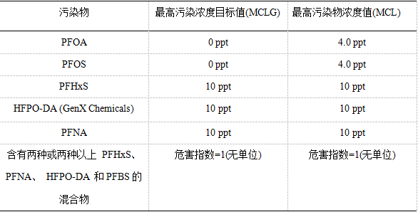 歐盟、美國(guó)、加拿大等國(guó)家都對(duì)飲用水中全氟化合物有相關(guān)的管控法規(guī),歐盟于2020年發(fā)布了《飲用水指令》(2020/2184),對(duì)飲用水中的PFAS總和提出了限制,從2021年1月12日起,所有PFAS物質(zhì)在人類飲用水中的含量不得高于0.5μg/L。美國(guó)環(huán)境保護(hù)署(EPA)發(fā)布針對(duì)全氟化合物(PFAS)的國(guó)家飲用水標(biāo)準(zhǔn)(NPDWR),其中對(duì)PFOA、PFOS、PFNA、PFHxS和HFPO-DA(GenX化學(xué)物質(zhì))這些特定全氟化合物設(shè)定了最高污染物目標(biāo)限值(MCLG)和最高污染物限值(MCL)。同時(shí),EPA針對(duì)含有兩種或兩種以上PFHxS、PFNA、HFPO-DA和PFBS的混合物引入了一項(xiàng)可法律強(qiáng)制執(zhí)行的危險(xiǎn)指數(shù)(HI)MCL,這些MCL限值將通過計(jì)算年平均值來確定。具體限制值如下: