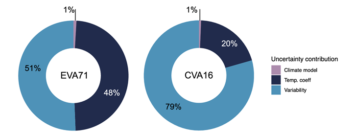 使用氣候驅(qū)動(dòng)的 CVA16 和 EVA71 腸道病毒模型來(lái)探索氣候變化對(duì)這兩種疾病在中國(guó)爆發(fā)的影響。根據(jù)各個(gè) CMIP6 氣候模型的溫度預(yù)測(cè),在中國(guó)對(duì) EVA71 和 CVA16 進(jìn)行了模擬。