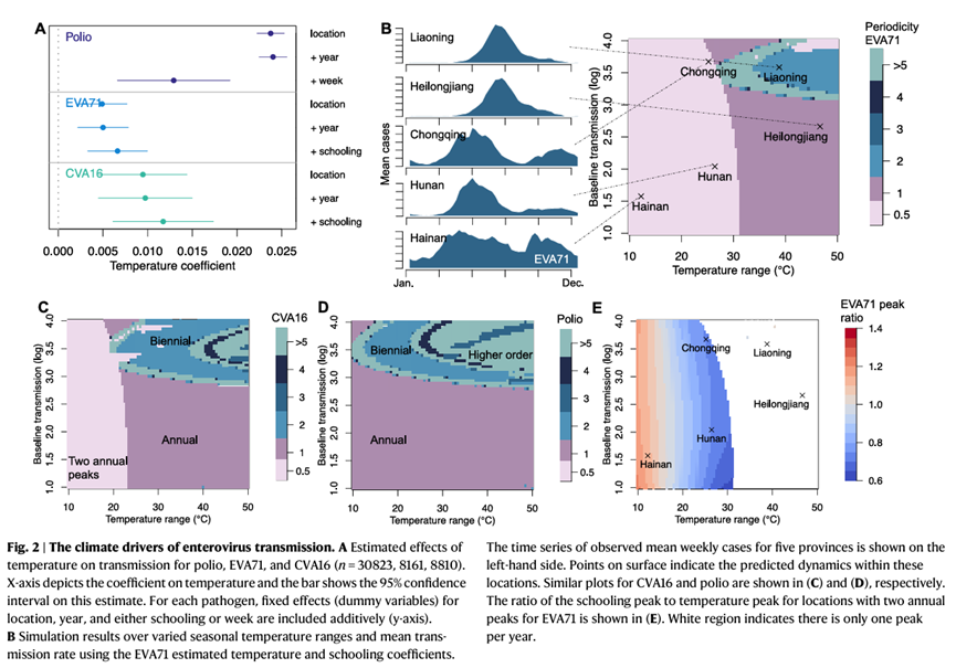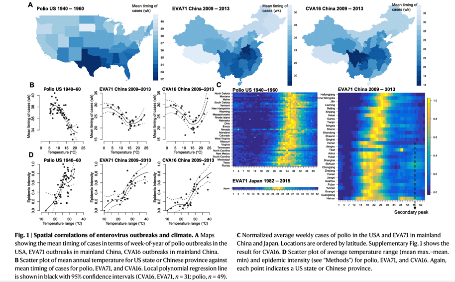近日來(lái),腸病毒(Enterovirus)在臺(tái)灣感染創(chuàng)新高,造成了不少學(xué)生發(fā)病。腸病毒包括脊髓灰質(zhì)炎病毒和柯薩奇病毒等,通常在夏季傳播,這表明腸病毒傳播可能與氣候有關(guān)。一直以來(lái),了解氣候變化對(duì)傳染病的影響對(duì)公共衛(wèi)生健康具有重要作用。Rachel E. Baker等人利用美國(guó)脊髓灰質(zhì)炎疫苗接種前的數(shù)據(jù),以及中國(guó)和日本導(dǎo)致手足口病的兩種腸道病毒(腸道病毒 71 型(EVA71)和柯薩奇病毒 16 型(CVA16)數(shù)據(jù),使用機(jī)制建模和統(tǒng)計(jì)方法評(píng)估腸病毒傳播的環(huán)境和人口驅(qū)動(dòng)因素以及氣候變化對(duì)未來(lái)腸病毒傳播的影響。