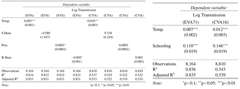 對(duì)溫度、比濕度、相對(duì)濕度和降水的經(jīng)驗(yàn)傳播率進(jìn)行單獨(dú)的回歸(圖2左)。發(fā)現(xiàn)溫度對(duì)傳播有顯著的積極影響,比濕度、相對(duì)濕度和降水的影響不顯著。為了消除可能的空間和時(shí)間偏差,溫度的正系數(shù)仍然很重要(圖3A)。對(duì)于 EVA71 和 CVA16,我們?cè)诎囟群蛯W(xué)校教育的回歸模型中發(fā)現(xiàn)學(xué)校教育對(duì)傳播有顯著影響(圖2右)。結(jié)果表明,溫度和學(xué)校教育都會(huì)影響腸道病毒的傳播。