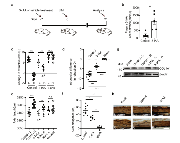 近一步動物驗證,當(dāng)受高度近視模型影響的小鼠接受來自健康供體的糞菌移植時,血漿中的3-IAA水平增加,同時高度近視的進展減緩,且鞏膜中的I型膠原蛋白α1(COL1A1)表達(dá)得到更好的維持。