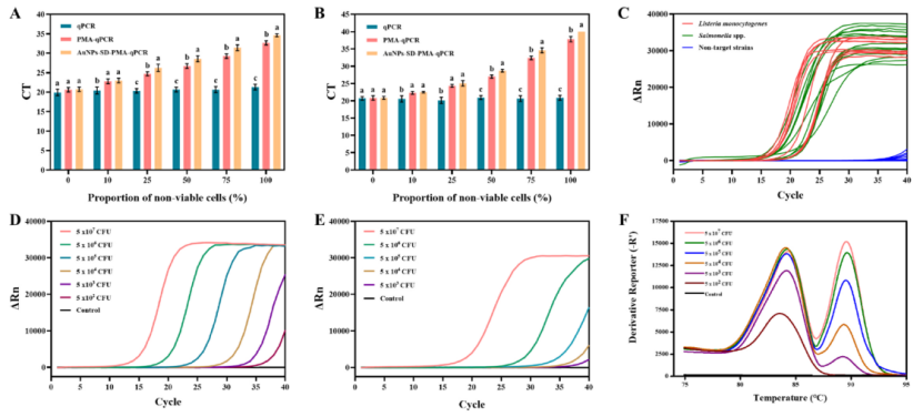 圖4所示。應用AuNPs-SD-PMA-qPCR、PMA-qPCR和qPCR技術鑒別L. monocytogenes(A)和Salmonella (B)的活/非活細胞。(C) AuNPs-SD-PMA-qPCR檢測的特異性。(D-E)不同梯度稀釋L. monocytogenes和Salmonella的擴增曲線。(F)不同梯度稀釋的L. monocytogenes和Salmonella的熔化曲線。不同小寫字母表示不同檢測方法擴增結果(Ct值)差異有統(tǒng)計學意義(p < 0.05)。