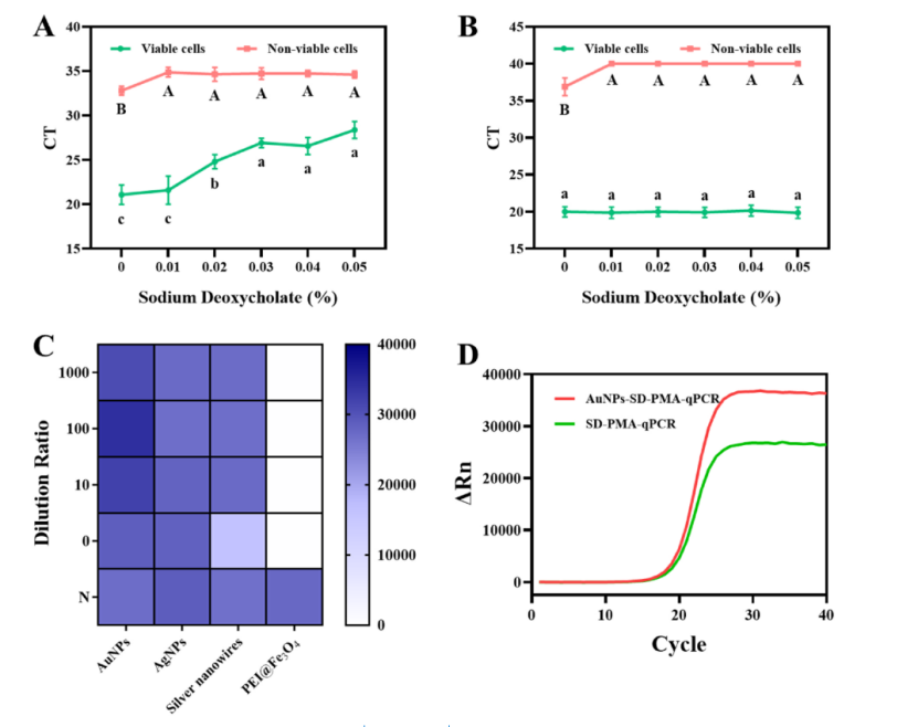 圖3所示。不同SD濃度對L. monocytogenes(A)和Salmonella (B)的影響。(C) AuNPs、AgNPs、PEI@Fe3O4和銀納米線對SD- pma - qpcr系統(tǒng)ΔRn值的影響。(D) AuNPs- SD-PMA-qPCR和SD-PMA-qPCR的擴增曲線。不同小寫字母表示不同非活細胞組間擴增結果(Ct值)差異顯著(p < 0.05),不同大寫字母表示不同活細胞組間擴增結果(Ct值)差異顯著(p < 0.05)。