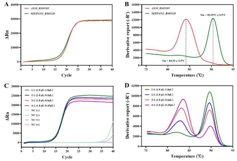 圖1所示。(A)引物AX10_RS05385和SEEPA511_RS03120 qPCR擴增曲線。(B) qPCR檢測引物AX10_RS05385和SEEPA511_RS03120的熔化曲線。(C) AX10_RS05385:SEEPA511_RS03120不同引物比例的擴增曲線。(D) AX10_RS05385:SEEPA511_RS03120不同引物配比的熔化曲線。