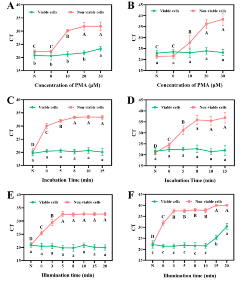 圖2所示。PMA處理的優(yōu)化。不同濃度PMA對L. monocytogenes(A)和Salmonella (B)的影響;不同孵育時間對L. monocytogenes (C)和Salmonella (D) 的影響;不同暴露時間對L. monocytogenes(E)和 Salmonella (F)的影響。不同的小寫字母表示非活細胞組間擴增結果(Ct值)有顯著差異(p < 0.05),不同的大寫字母表示活細胞組間擴增結果(Ct值)有顯著差異(p < 0.05)。