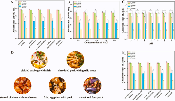 在LB培養(yǎng)基中添加相同濃度的金黃色葡萄球菌時(shí),不同食品添加劑、不同NaCl濃度、不同pH值存在下,SapYZUs7@MnCo2O4反應(yīng)體系的吸光度值一致。結(jié)果表明這些因素不影響金黃色葡萄球菌的檢測(cè)。SapYZUs7@MnCo2O4成功應(yīng)用于不同添加劑、NaCl濃度和pH值的食品樣品中S. aureus的顏色測(cè)定。此外,使用研究人員提出的 SapYZUs7@MnCo2O4顯色系統(tǒng)獲得的結(jié)果與傳統(tǒng)方法的結(jié)果一致。