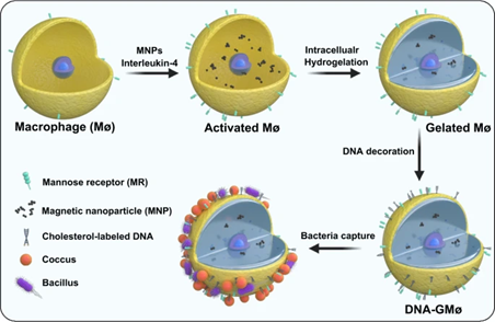 首先將M?s與超順磁性氧化鐵納米顆粒孵育,以獲得磁性細胞。同時使用細胞因子(如IL-4)誘導(dǎo)病原體結(jié)合受體的上調(diào)。然后通過直接滲透光引發(fā)劑和單體,以及隨后的紫外線照射,實現(xiàn)胞內(nèi)水凝膠化。最后,響應(yīng)特定細菌的DNA傳感元件(例如DNAzyme)可以很容易地修飾在凝膠細胞上,以便方便,快速和高靈敏度的熒光讀數(shù)。