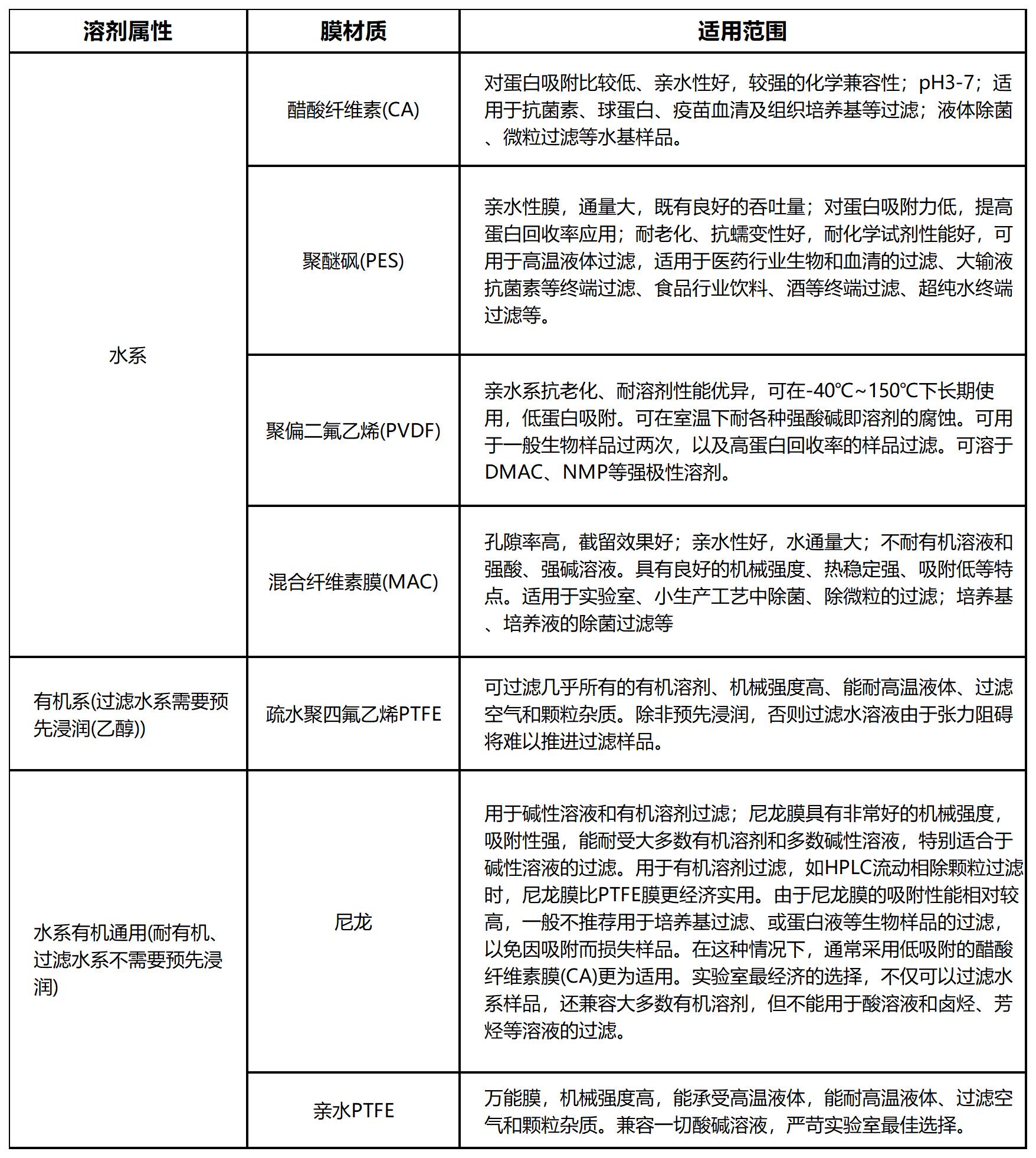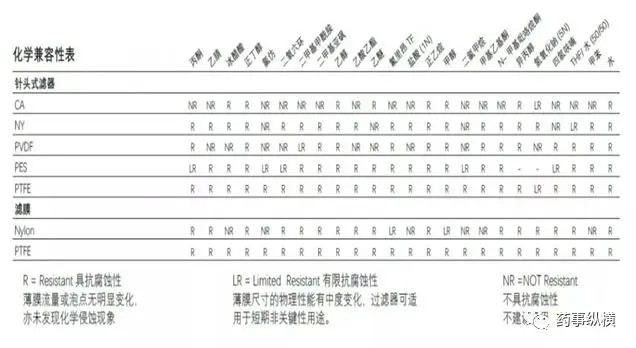 4、兼容性:不同的濾膜對不同的濾膜兼容性見下表。