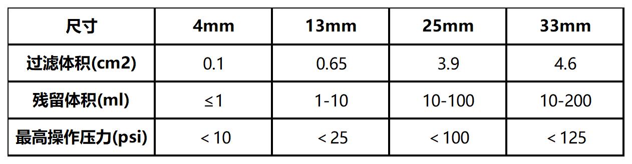 1、尺寸:常用的針式過濾器有4mm、13mm、25mm、33mm規(guī)格,針頭式濾器規(guī)格的選擇通常是與樣品的體積有關(guān):通常樣品量小于1mL時,選用4mm直徑的針頭式濾器;樣品量在1-10mL時,選用13mm直徑的針頭式濾器;樣品量在10-100mL時,選用25mm直徑的針頭式濾器;樣品量在10-200mL時,選用33mm直徑的針頭式濾器。