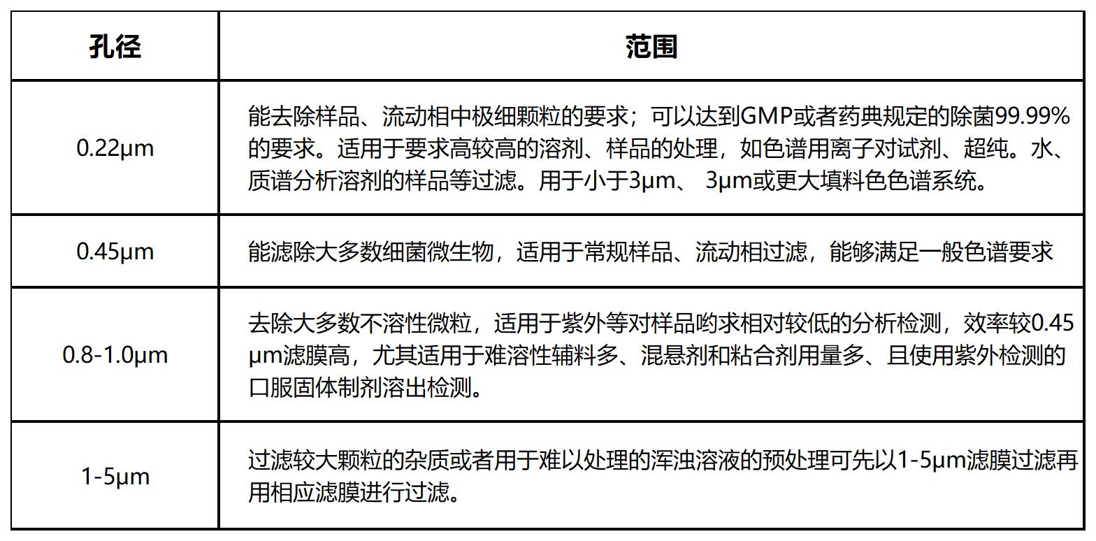 2、孔徑:常用的孔徑有0.22μm,0.45μm,0.8μm,1.0μm。