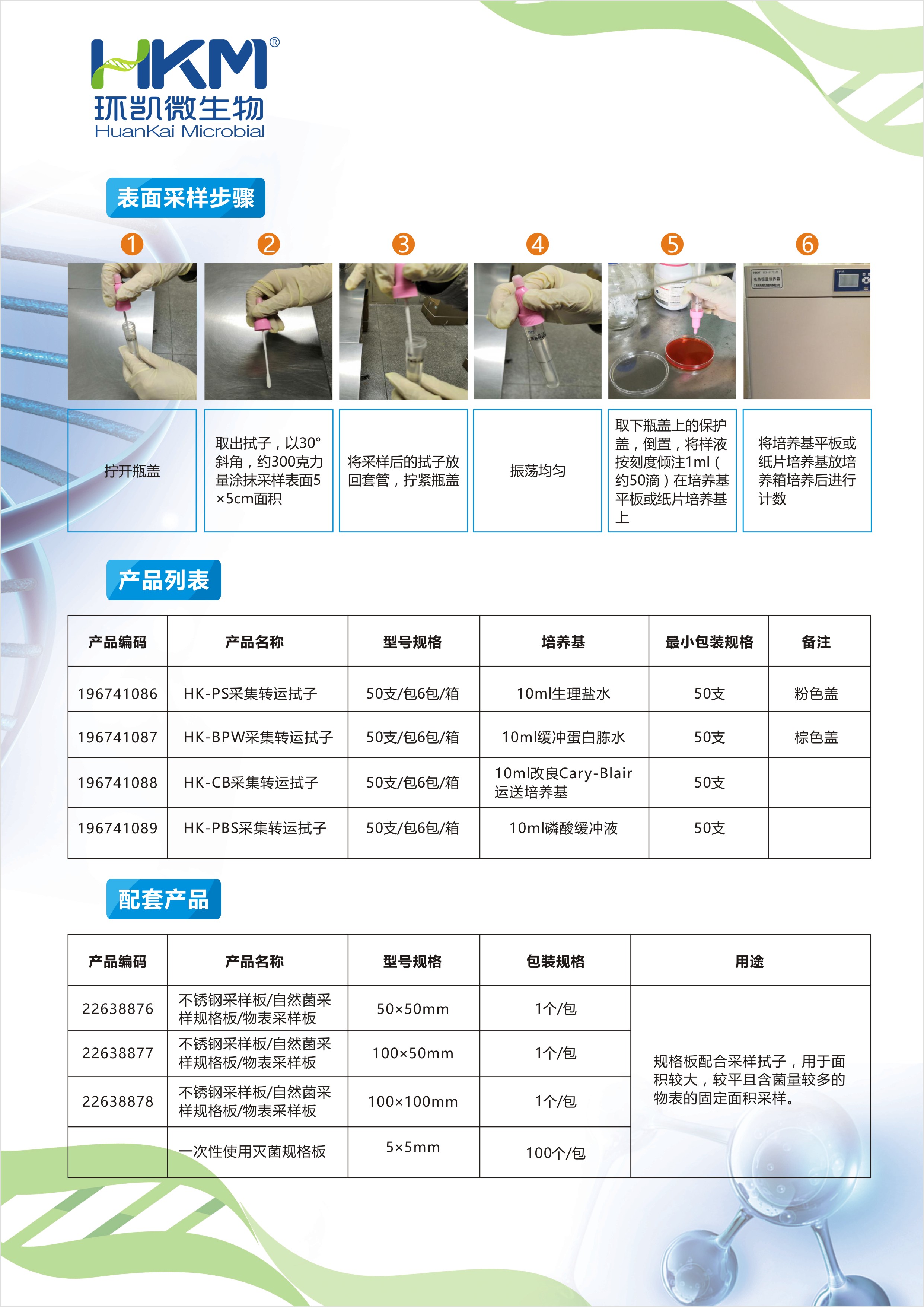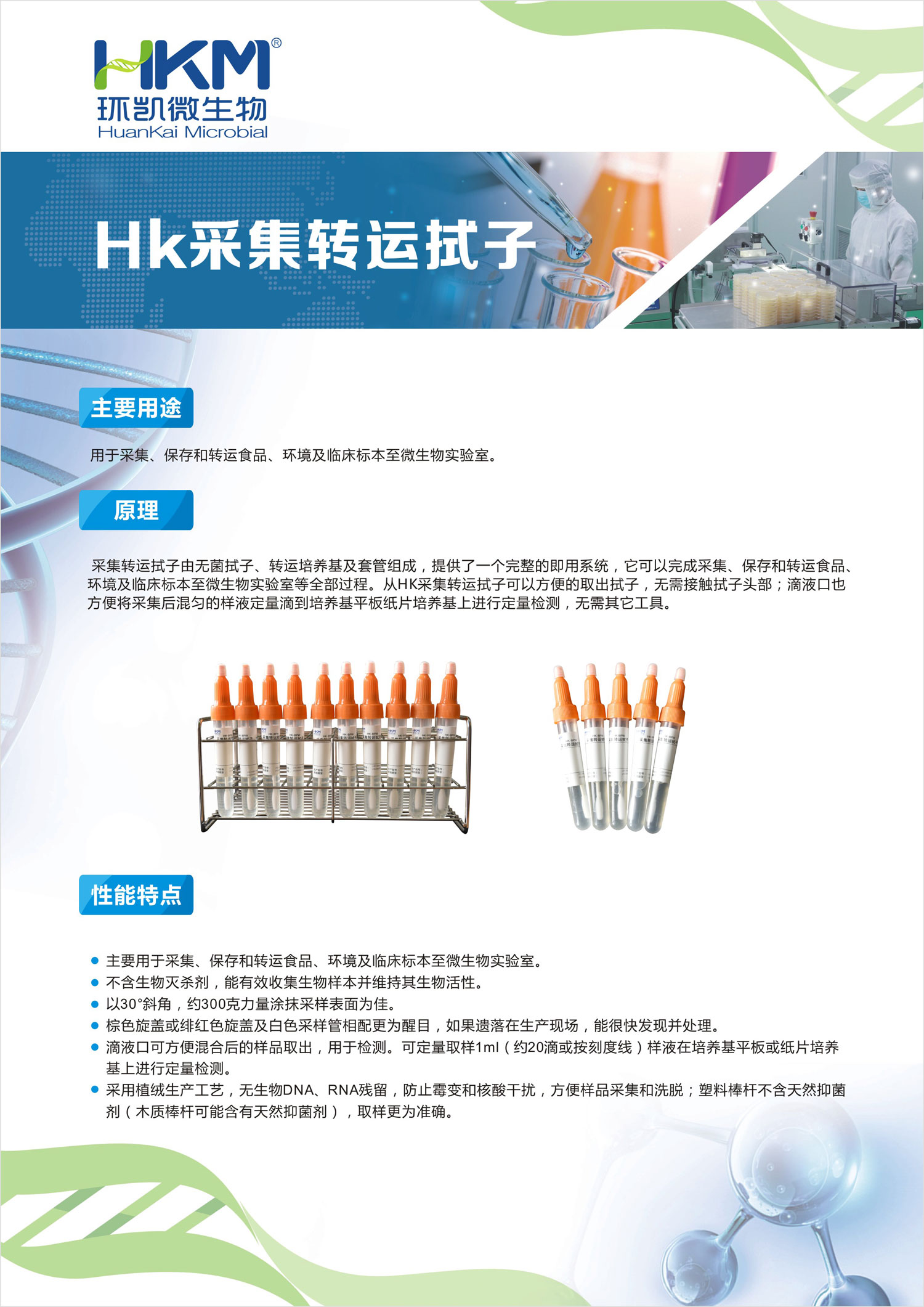采集轉(zhuǎn)運拭子由無菌拭子、轉(zhuǎn)運培養(yǎng)基及套管組成,提供了一個完整的即用系統(tǒng),它可以完成采集、保存和轉(zhuǎn)運食品、環(huán)境及臨床標(biāo)本至微生物實驗室等全部過程。從HK采集轉(zhuǎn)運拭子可以方便的取出拭子,無需接觸拭子頭部;滴液口也方便將采集后混勻的樣液定量滴到培養(yǎng)基平板紙片培養(yǎng)基上進(jìn)行定量檢測,無需其它工具。