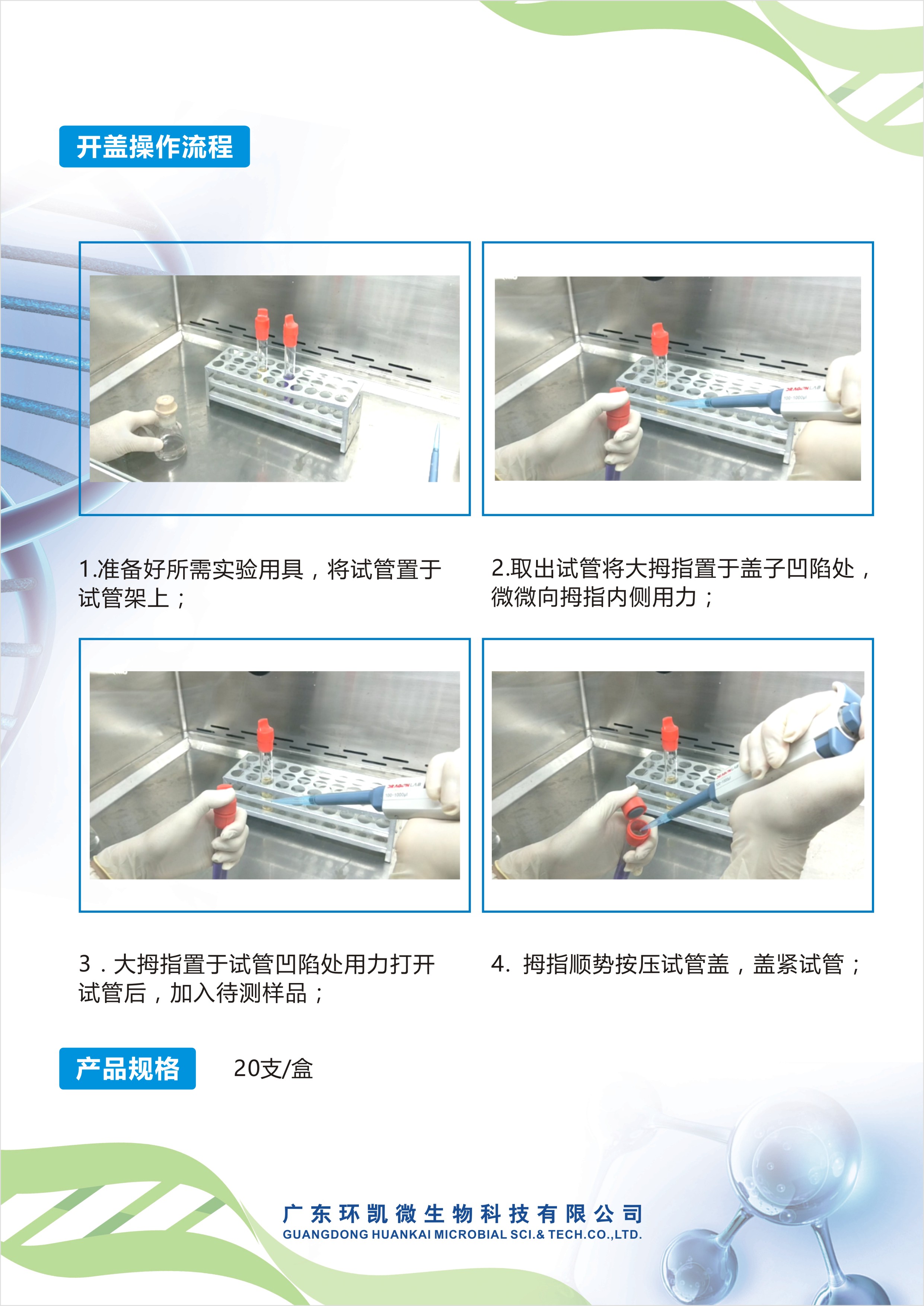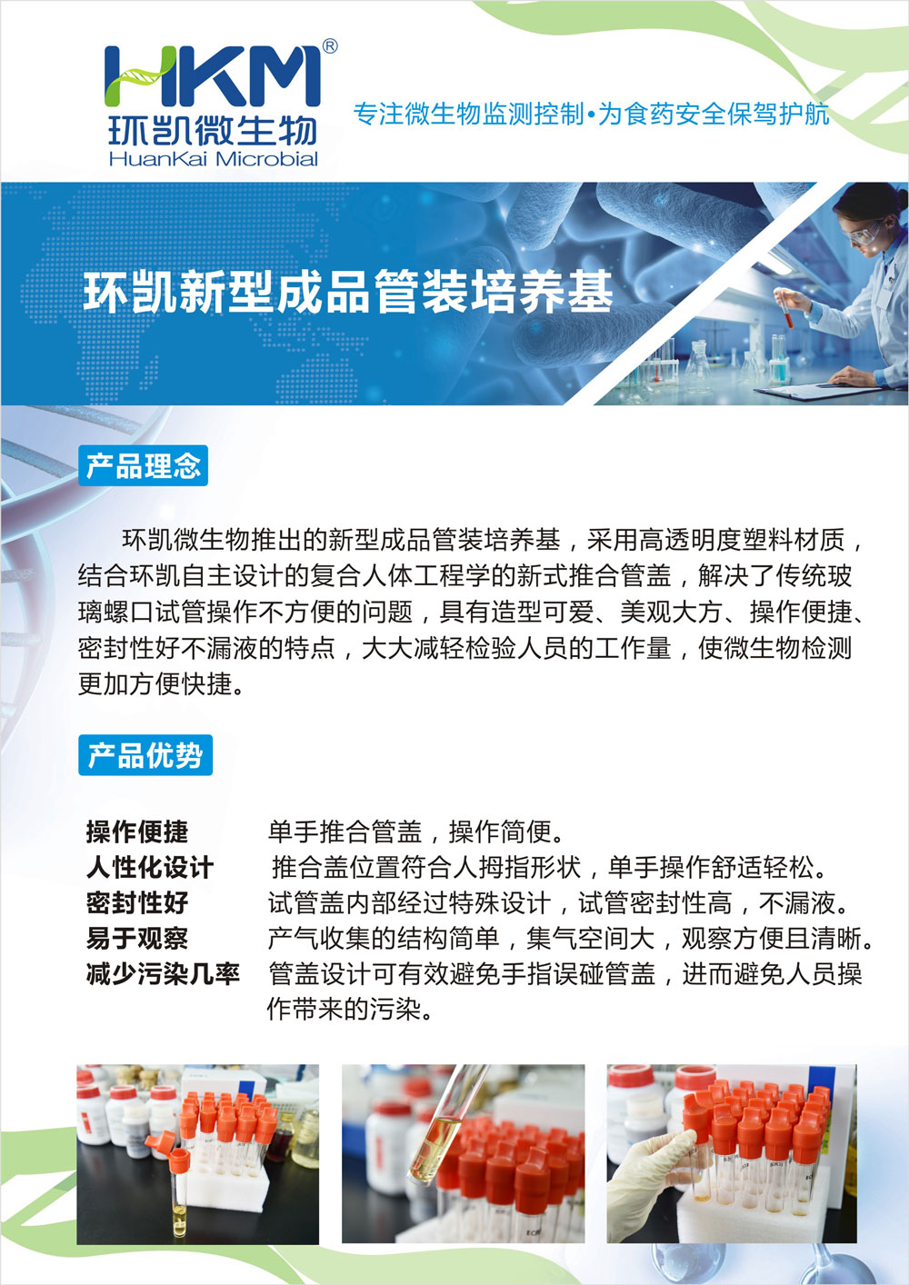 環(huán)凱微生物推出的新型成品管裝培養(yǎng)基,采用高透明度塑料材質(zhì),結(jié)合環(huán)凱自主設(shè)計的復(fù)合人體工程學(xué)的新式推合管蓋,解決了傳統(tǒng)玻璃螺口試管操作不方便的問題。具有操作簡便、人性化設(shè)計、密封性好、易于觀察、減少污染幾率等優(yōu)勢。
